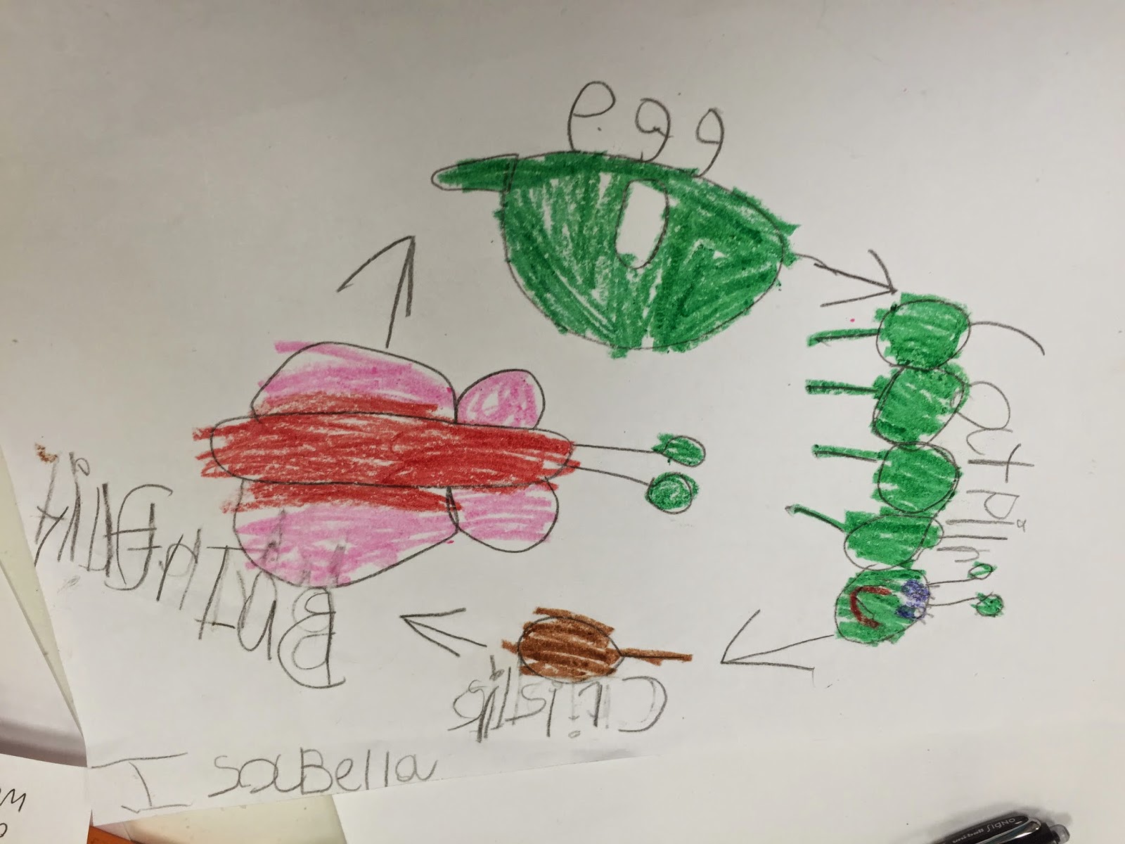 | We have been observing the butterflies daily and writing about them in our Science Journals. We learned that it takes several hours for the butterfly wings to dry after they are born! |